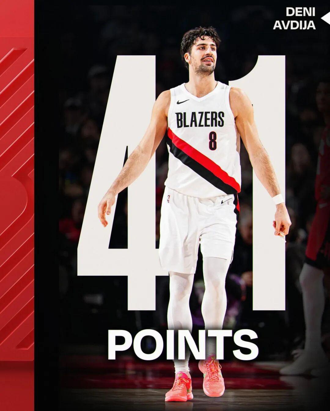 拿上一场比赛来说,开拓者主场103-102险胜火箭,这场阿夫迪亚交出生涯之夜:全场出战39分钟,投篮24中13,三分9中2,罚球15中13,拿下41分6篮板2助攻1抢断。