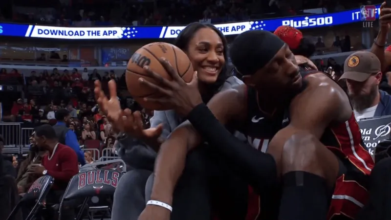 场上球员都在热身投篮,阿德巴约和现场观战的女朋友阿贾-威尔逊场边“秀恩爱”。