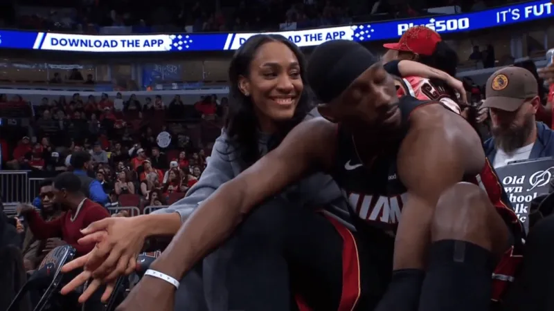 场上球员都在热身投篮,阿德巴约和现场观战的女朋友阿贾-威尔逊场边“秀恩爱”。